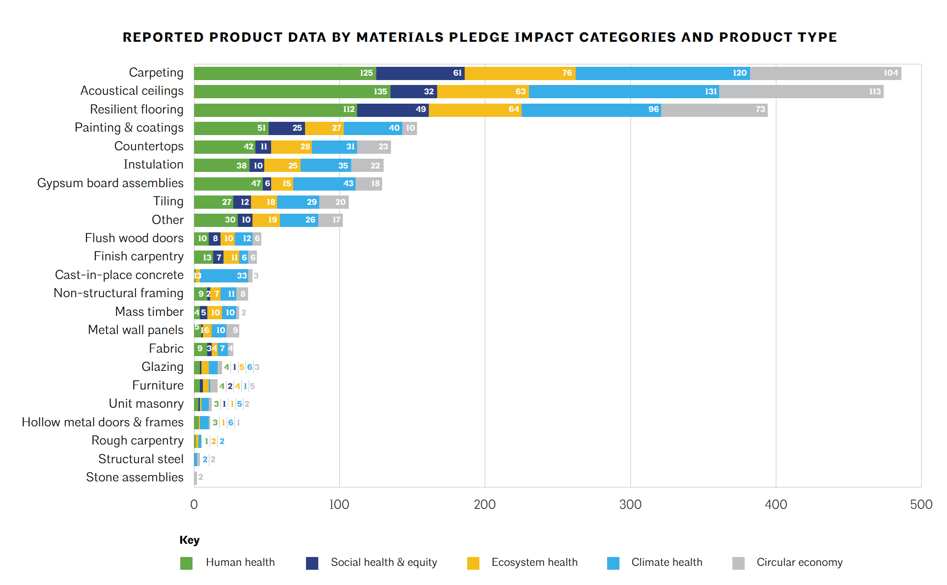 The AIA Materials Pledge asks architectural firms to report product data across five impact categories — human health, social health and equity, ecosystem health, climate health, and circular economy. Participation in the reporting process grew this year, with 419 projects submitted by 86 firms. A substantial number included product-level data, but overwhelmingly focused on what architects touch most directly: finishes.