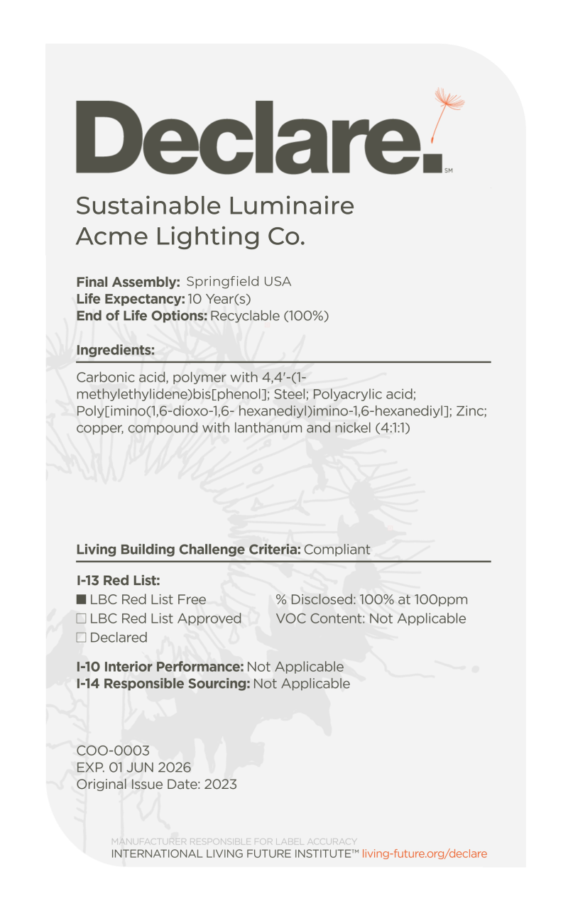 A major challenge for lighting is structural: fixtures are rarely simple. They often involve complex assemblies with multiple materials, component suppliers, and configuration options. Producing comprehensive materials transparency documentation — such as Declare labels or Environmental Product Declarations (EPDs)—is simply more difficult and expensive for lighting manufacturers than it is for finish vendors.