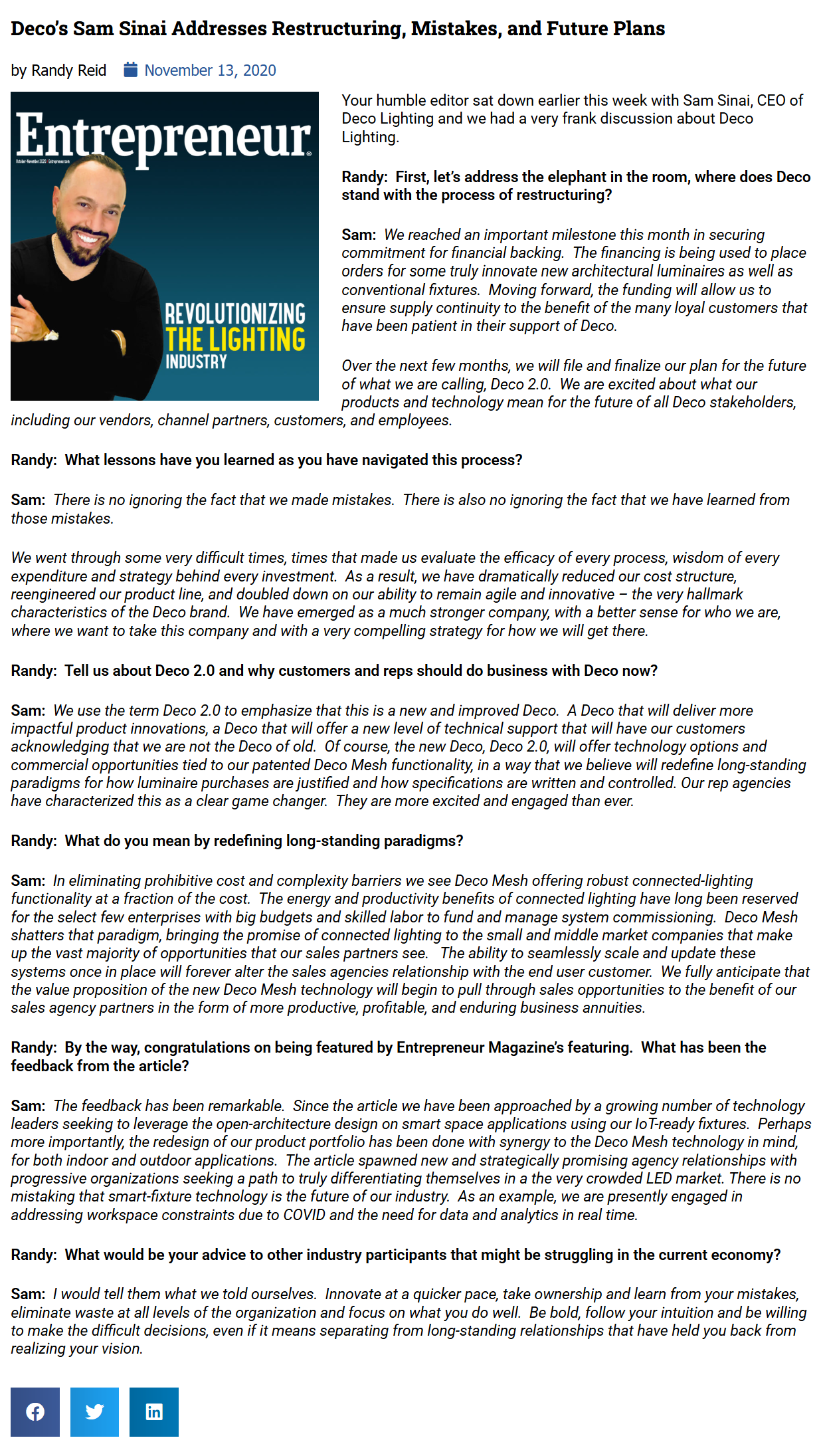 During the bankruptcy period, Deco’s public-facing talking points were amplified through EdisonReport, which regularly published Deco-friendly narratives that largely reflected Deco’s framing without scrutiny. When Deco’s bankruptcy first became known to the industry, an EdisonReport headline news article announced it with the lead sentence: “Deco Lighting is restructuring operations and financial affairs to support its growing wireless technology offering.” The article made no reference to bankruptcy and later disappeared from the site without explanation.