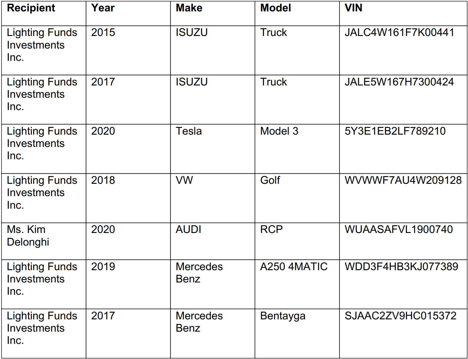 Still no lease documentation. Seven vehicles were transferred for a loonie each. One car, a Tesla, was reportedly in such bad shape it had “negative equity.” Delonghi refused to take that one.