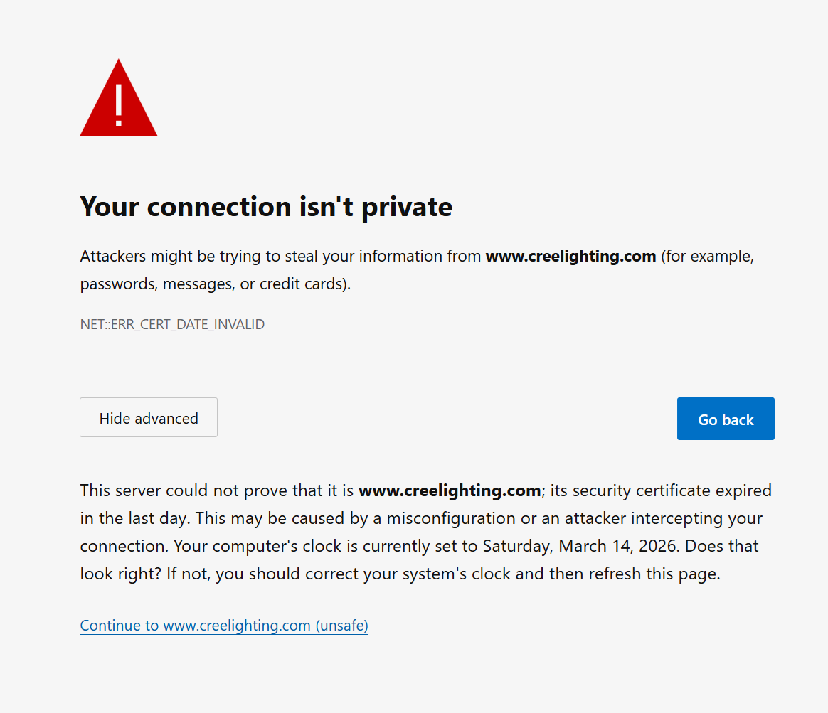 This occurred on Chrome, Edge and Firefox using multiple IP addresses. Modern browsers block access to sites with this kind of security problem, even when the underlying issue is routine. The question isn’t necessarily sabotage. These things happen. But this also happened to five Cree-owned web domains: