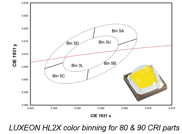 “Engineers rely on minimums for determining the number of emitters needed and ultimate performance expectations. With our 340lm minimum parts, they will be working some of the brightest LEDs in their class, making it easier to design efficient and cost-effective systems,” said Alvin Yeoh, Product Manager. “And consistency, already a hallmark of LUXEON HL2X, is now achievable to an even finer degree. We have bisected of our central 3-step bin creating bins above and below the black body locus giving the lighting engineer greater control and confidence in the consistency of the finished product.”