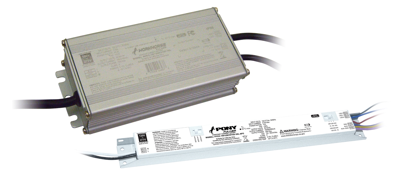 The WorkHorse (WHCC) Constant Current line is designed for high output and outdoor applications, with compatibility across a wide range of LED luminaires and multiple mounting options. Fulham offers high output current in 75W and 100W now, and high output voltage options are coming soon in even higher wattages. Other features include robust surge protection of 6kv differential and 10kv common, IP66, UL Class P, 0-10V dimming, and programmable output current.