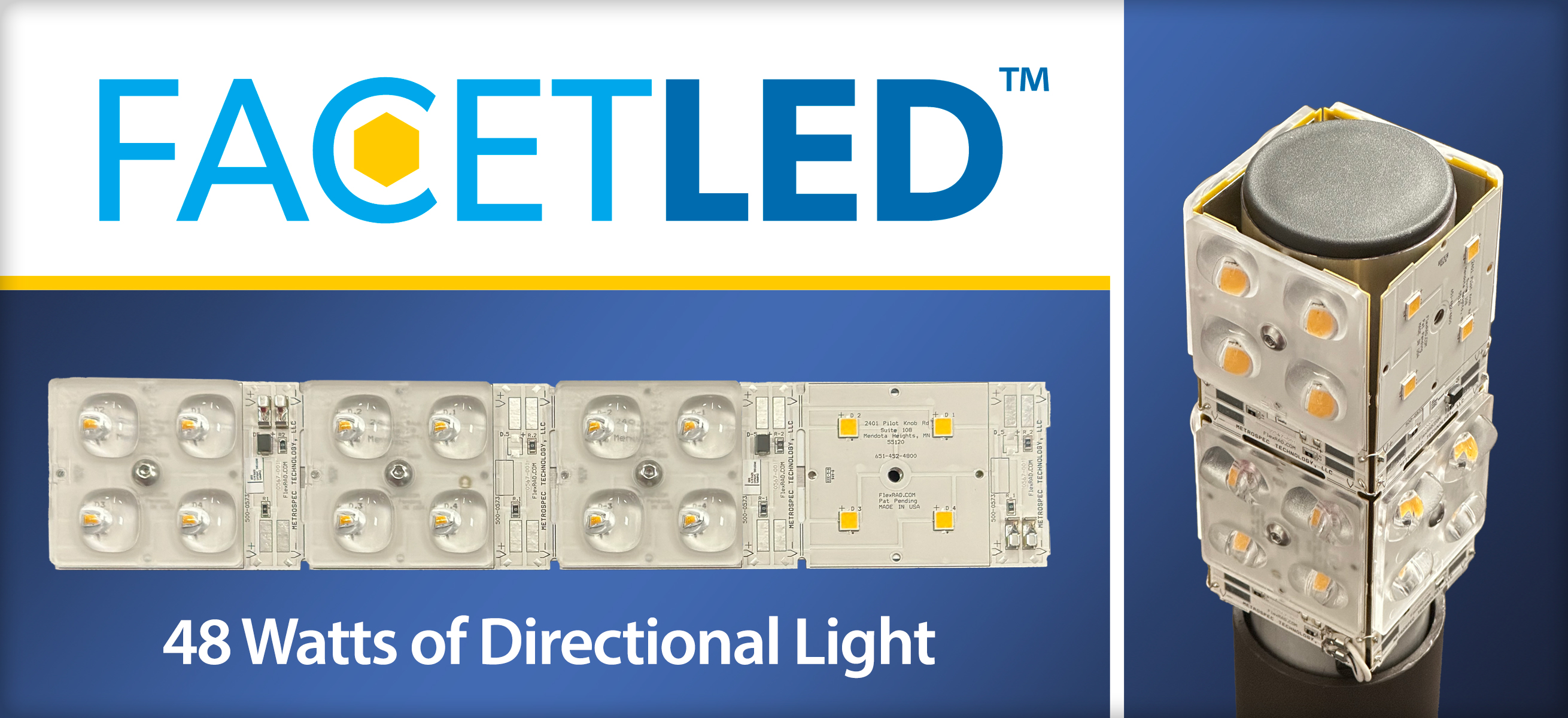 ST. PAUL, MN, September 20, 2024 - MetroSpec Technology, the leading American manufacturer of custom LED light sources, announces FlexRad FacetLED is now available for outdoor fixture solutions. MetroSpec will show FacetLED at the IES Street & Area Conference in Atlanta, GA, September 22-25, with exhibition at Bill Brown Sales Booth #802 and Khatod Table 9, September 23-24.