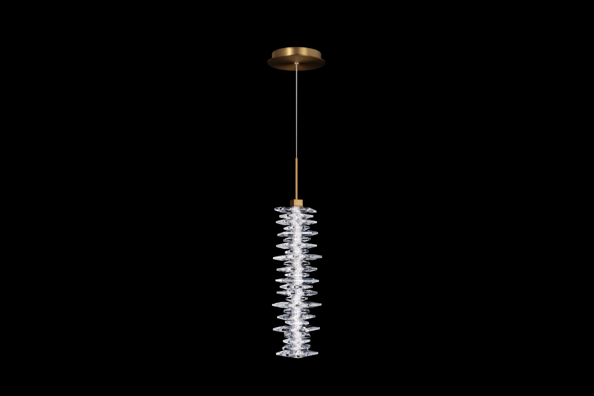 Andean — A bold line of natural wood, alive with raw grain and texture, creates a warm yet striking frame for the Andean crystal wall sconce. Inside, faceted Optical Crystal bars flash like cut gems, bouncing light in a hypnotic rhythm. Soft illumination pours up and down through the crystals, flooding the room with a moody, captivating glow. It’s more than a fixture—an artful collision of nature and luxury, designed to turn heads. A matching pendant is also available.